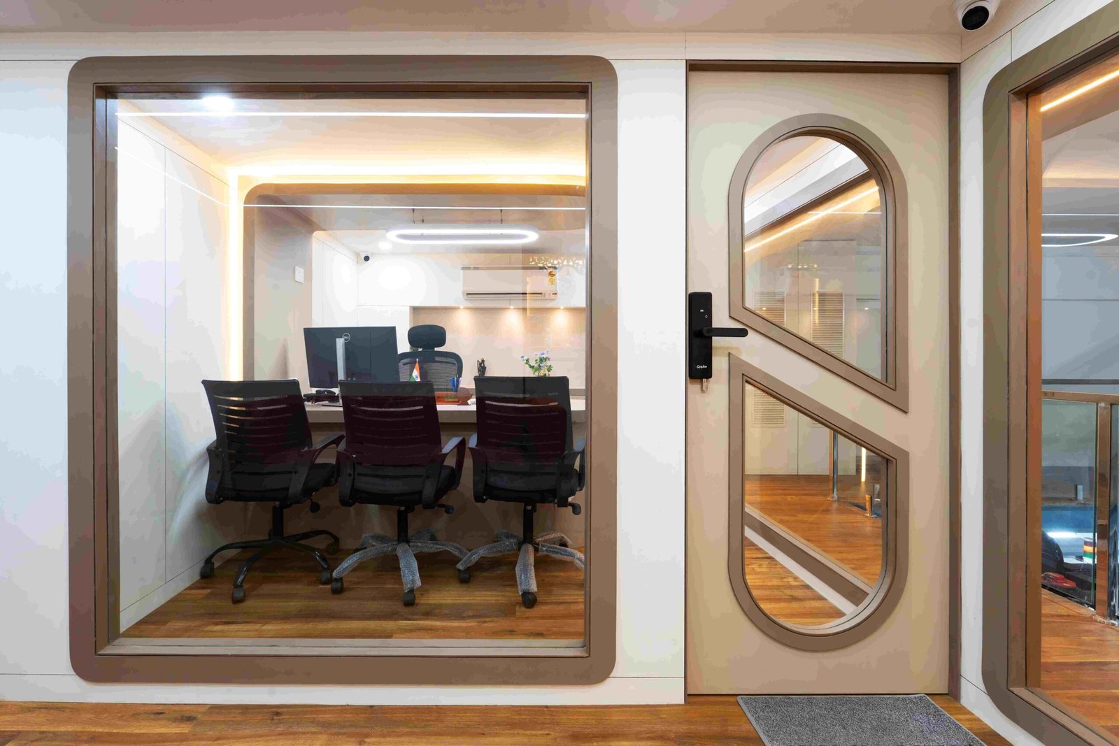 A high-energy conference space designed for impactful decision-making. Featuring a bold geometric ceiling with red acoustic panels and integrated LED tracks, this room blends professional sharp lines with a vibrant modern edge. Equipped with premium ergonomic seating, it’s the perfect environment for leadership collaboration.